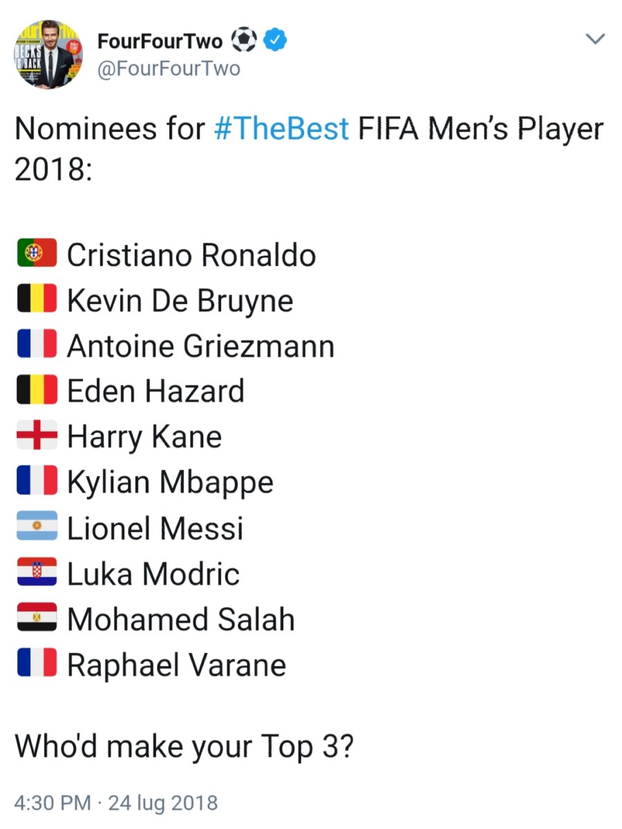 FourFourTwo è una rivista mensile di calcio, pubblicata da Haymarket che ogni anno anticipa i dieci candidati al premio miglior giocatore dell’anno, che in passato rappresentava il pallone d’oro.