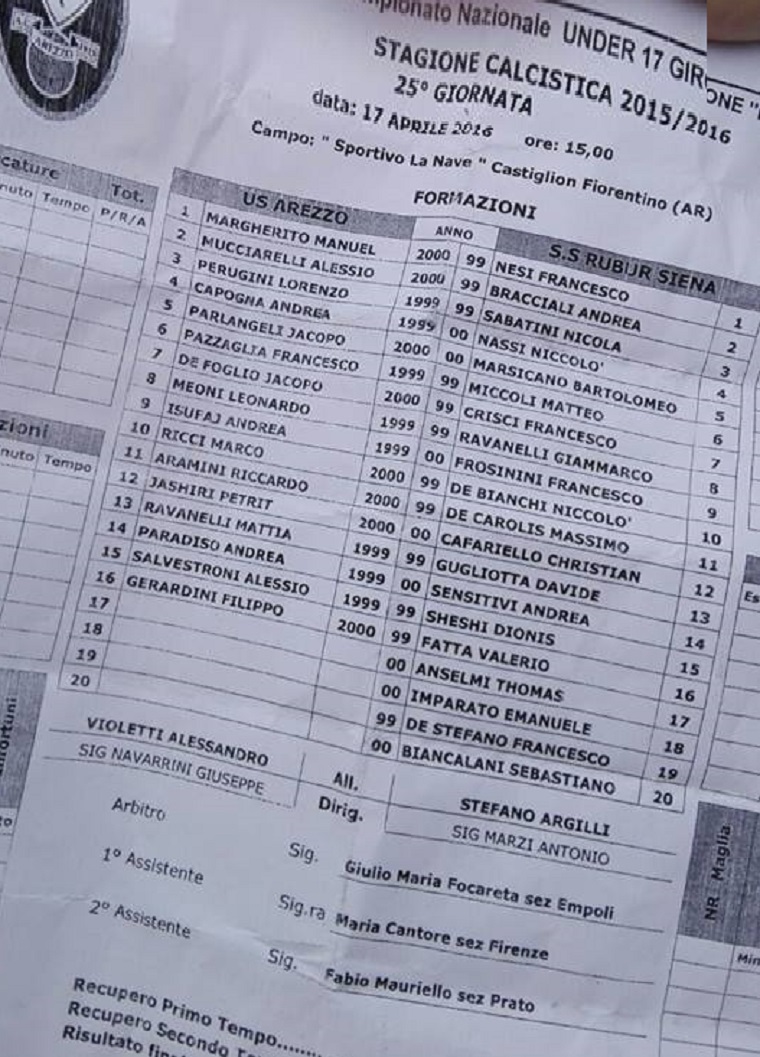 Al centro sportivo “La Nave” di Castiglion Fiorentino (AR) si è disputata ieri pomeriggio la gara tra Arezzo e Siena, valida per la 25° giornata del campionato Allievi Lega Pro, girone D. L‘Arezzo scende in campo con Margherito tra i pali mentre in avanti partono dal primo minuto Ricci, Aramini e Isufaj. Nel Siena c’e’ Nesi in porta, in difesa Sabatini e Bracciali e in avanti la coppia gol De Carolis-Crisci