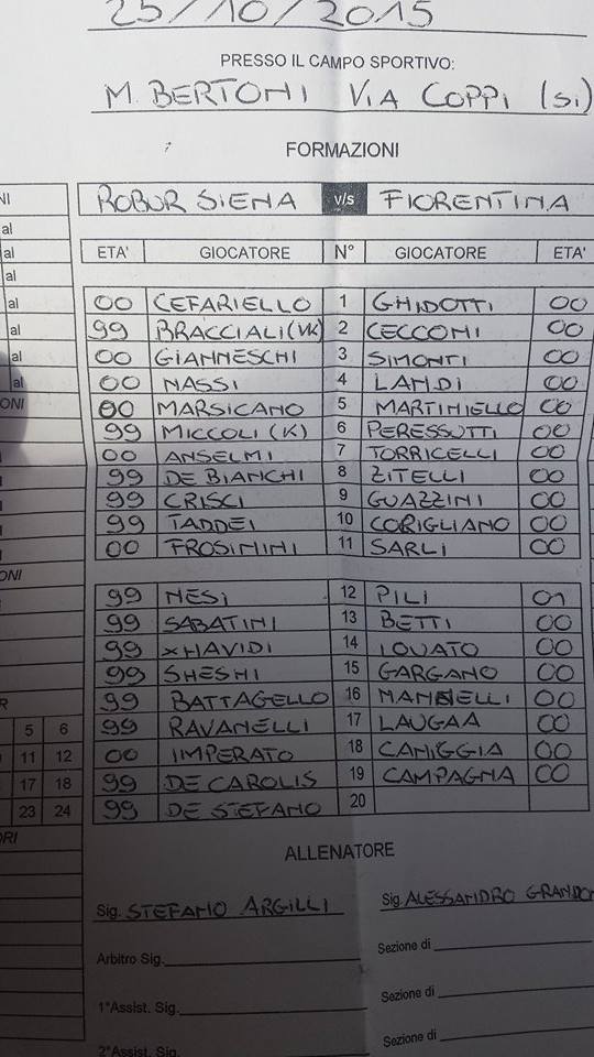 Si è giocata domenica pomeriggio, presso il centro sportivo “M. Bertoni” di Acquacalda, quartiere di Siena, la gara tra la Robur Siena e la Fiorentina valida per la 7^ giornata del campionato Allievi Lega Pro.