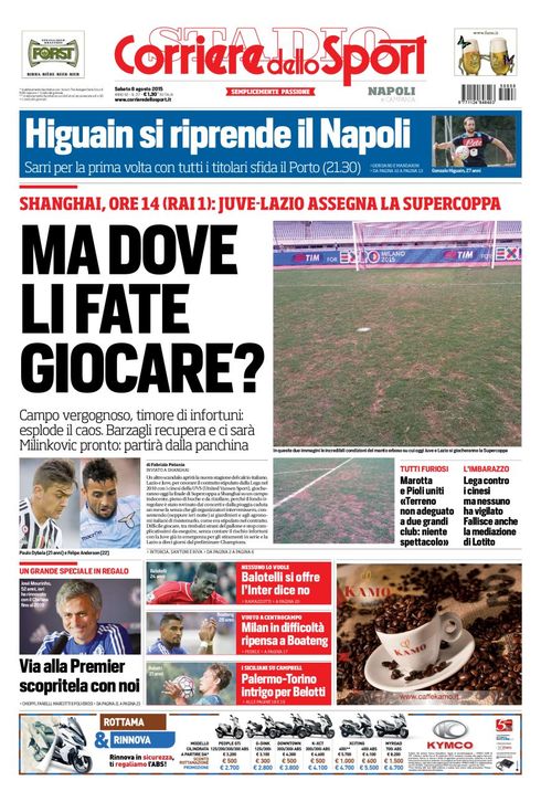 Il Corriere dello Sport-Stadio dedica una parte della prima pagina al rientro in organico di Gonzalo Higuaín, oltre all’introduzione della gara amichevole tra Porto-Napoli, che andrà di scena questa sera alle ore 21:00 all’Estadio do Dragao, preceduta da uno show organizzato dalla stessa società portoghese, in occasione della presentazione della nuova rosa per la stagione calcistica 2015/2016.