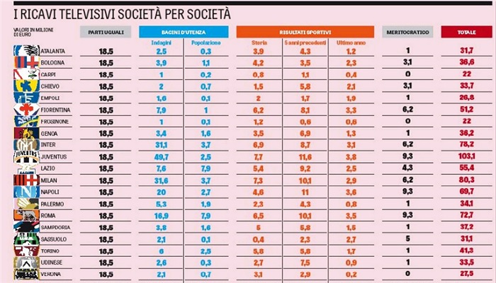 “In Lega si è deciso di seguire la vecchia ripartizione fino a quota 809 milioni, vale a dire il montepremi netto della passata stagione: il restante 30% sarà suddiviso in base ai bacini d’utenza, col 25% stabilito dalle ricerche sul tifo e il 5% dai dati Istat sulla popolazione residente nel Comune in cui gioca la squadra; l’altro 30% sarà distribuito secondo i risultati, col 10% relativo alla storia sportiva (dal 1946-47), il 15% ai cinque anni precedenti e il 5% alla stagione in corso”.