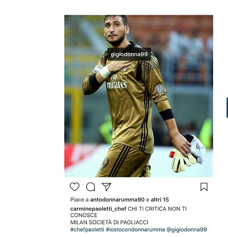 Come è stato segnalato durante SportItalia, uno strano post è apparso pochi minuti fa sul profilo Instagram del cognato di Donnarumma, Carmine Paoletti, marito della sorella. Post apparso e scomparso nel giro di un niente, dai toni decisamente polemici: “Chi ti critica non ti conosce“, questa la descrizione della foto caricata. Ma la parte che più ha destato scalpore è quella successiva: “Milan società di pagliacci“, ha scritto Paoletti a caratteri cubitali.