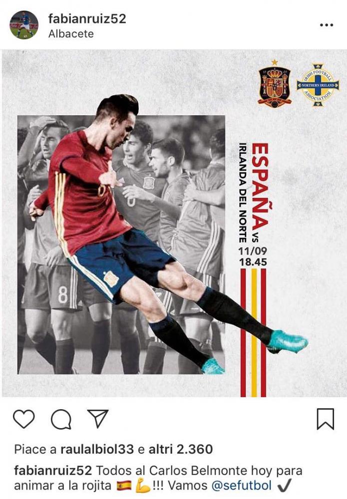 Su Instagram Fabian Ruiz, chiede aiuto a tutti i tifosi spagnoli chiamandoli a raccolta per la Nazionale Under 21 in vista della sfida contro l’Irlanda del Nord. Ecco la foto postata sui social dallo Spagnolo: