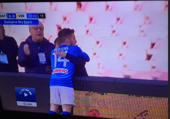 Dries Mertens centra il palo da posizione difficile contro l’Hellas Verona. Subito dopo, però, di slancio arriva praticamente in contatto con un piccolo raccattapalle e lo abbraccia. Il ragazzino ha l’espressione felice per l’abbraccio inaspettato.