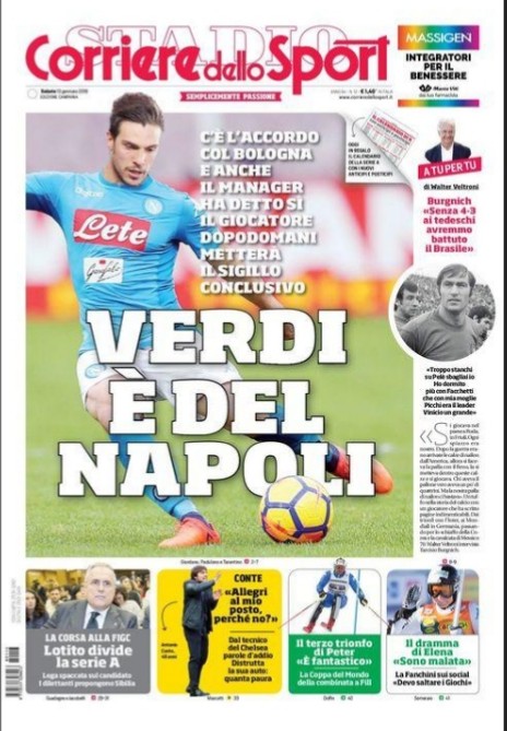 L’annuncio del Corriere dello Sport in prima pagina: “Verdi è del Napoli, dopodomani il sigillo definitivo”. Inoltre, in apertura si legge anche: “C’è l’accordo col Bologna e anche il manager ha detto sì, il giocatore dopo domani metterà il sigillo conclusivo”.