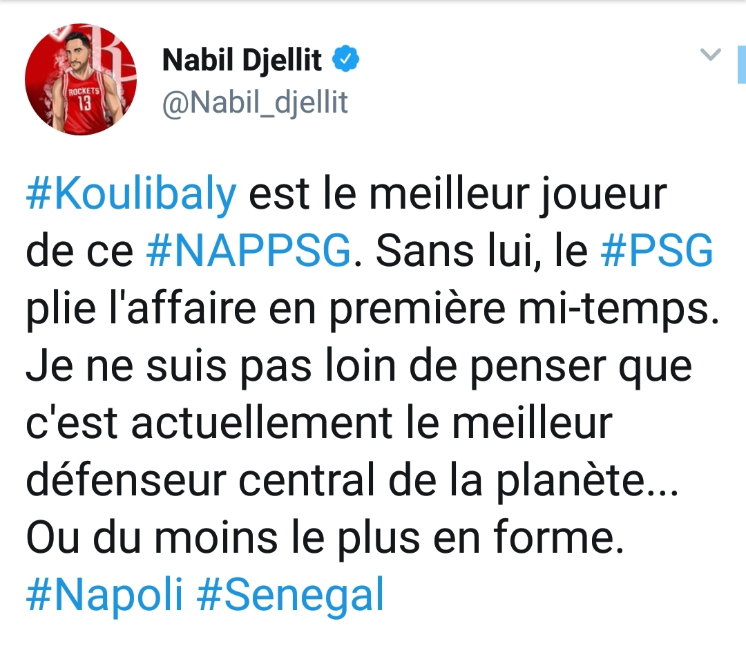 Il giornalista di France Football, Nadil Djellit, nel commentare la sfida di Champions League Napoli-Psg, ha dedicato alcuni tweet su alcuni giocatori azzu: “Koulibaly migliore giocatore di Napoli-Psg, penso che sia diventato il miglior difensore al mondo. Allan è fenomenale”.