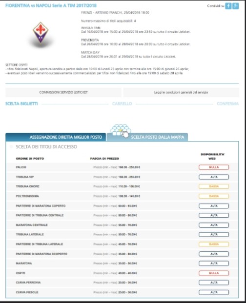 In poche ore sono già esauriti i biglietti per il settore ospiti dell’Artemio Franchi per il big match tra Fiorentina e Napoli. Saranno circa  2.400 i tifosi azzurri che sosterranno la squadra di Maurizio Sarri a Firenze. Sarà un vero e proprio esodo azzurro: potrebbero essere complessivamente 10mila i cuori napoletani sugli spalti. In allegato l’immagine da Listicket.