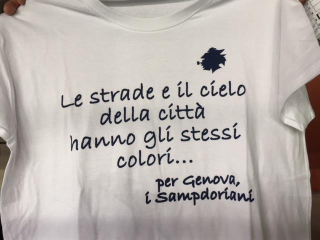 Stasera i tifosi della Sampdoria renderanno omaggio alle vittime del crollo del Ponte Morandi. I Gruppi della Sud e la Federclubs, hanno deciso di scendere in campo in prima persona per aiutare le famiglie sfollate mettendo in vendita delle magliette (vedi foto) con questa frase: