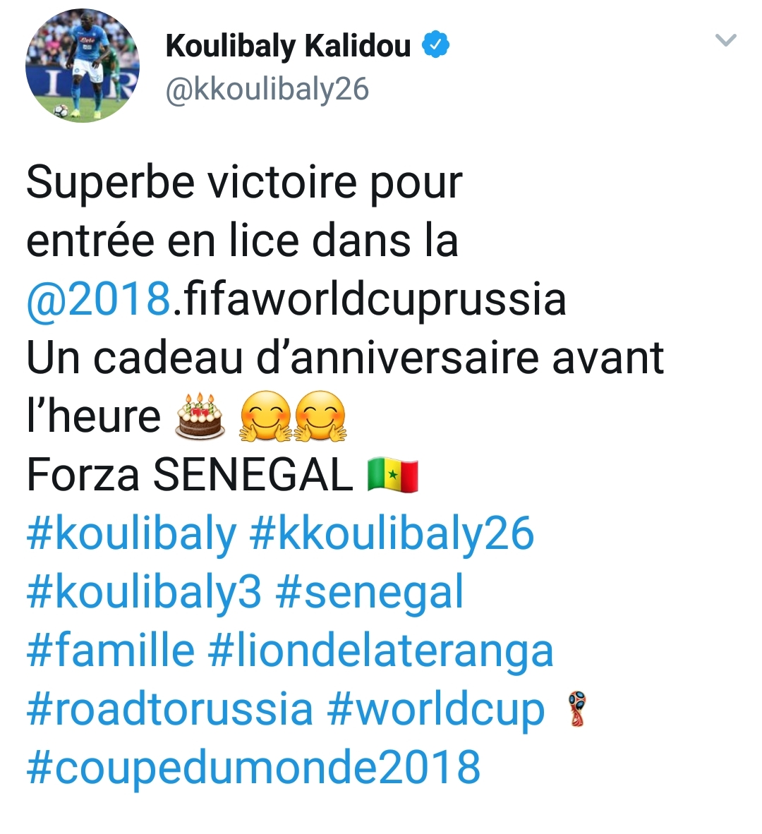 Vittoria all’esordio contro la Polonia di Milik e Zielinski per Kalidou Koulibaly che insieme al suo Senegal ottiene 3 punti preziosi per la qualificazione agli ottavi di Finale di Russia 2018. Il difensore del Napoli poco fa ha twittato tutta la sua gioia sottolineando di aver avuto un regalo anticipato visto che festeggia oggi il suo 27esimo compleanno: