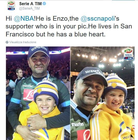 Immortalato con la maglia del Napoli in NBA dal fotografo ufficiale della massima serie americana di Basket durante il match Golden State-Memphis. Oggi la Serie A tramite il proprio account ufficiale Twitter ci propone altre foto e ci spiega chi è: “Lui è Enzo, il tifoso del Napoli che è nella foto dell’NBA. Vive a San Francisco, ma ha un cuore azzurro”. Ecco le foto: