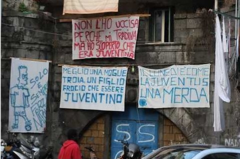 Tra un’edicola votiva e un basso, tra un balcone e un altro, l’intero slargo è stato tappezzato di slogan e striscioni anti-juventini. E si va giù pesante, con frasi ingiuriose come «Meglio una moglie troia o un figlio frocio che essere juventino», «Non l’ho uccisa perché ho scoperto che mi tradiva ma perché era juventina», «Il lunedì è come la juventus, una merda» e «Salvini caccia via gli juventini», con tanto di disegno di una bara.