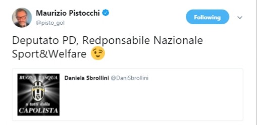 “Deputato PD, Responsabile Nazionale Sport&Welfare”: questa la didascalia che accompagna la foto postata da Maurizio Pistocchi sul proprio profilo Twitter. Il giornalista ha retweetato un post di Daniela Sbrollini, volto noto della politica, che manifestava chiaramente la sue fede juventina.