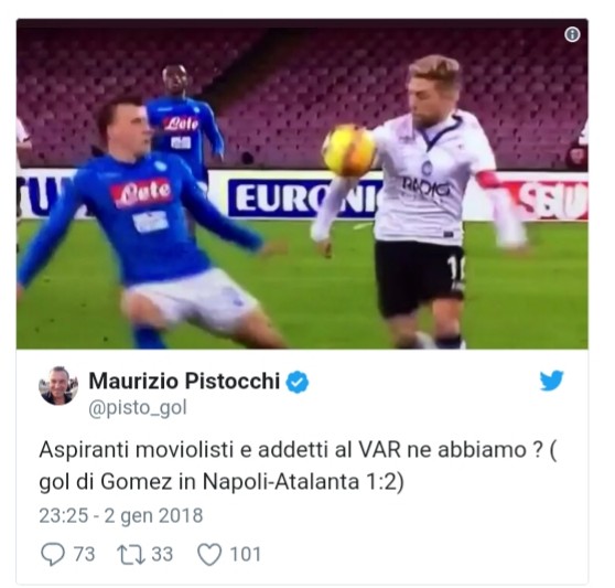 Il gol di Gomez viziato da fallo di mano. Maurizio Pistocchi, su Twitter ha mostrato un fermo immagini che evidenzia proprio l’episodio in questione: “Aspiranti moviolisti e addetti al VAR ne abbiamo? (gol di Gomez in Napoli-Atalanta 1:2)”.