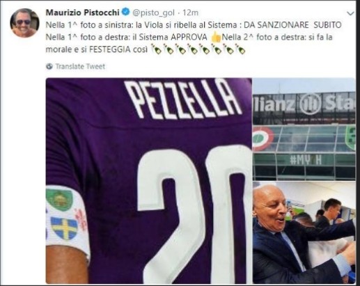 Il Tweet polemico di Pistocchi: in merito alla multa per non aver rispettato la regola della fascia da capitano per la Fiorentina (in ricordo di Davide Astori), a confronto dei festeggiamenti della Juve e di Marotta con il simbolo dei 36 scudetti (compresi i 2 revocati dalla giustizia sportiva.)