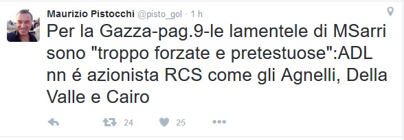 Intervento a gamba tesa quello di Maurizio Pistocchi verso la Gazzetta dello Sport. Il giornalista Mediaset, attraverso il propio profilo Twitter, si schiera al fianco del Napoli e di De Laurentiis attaccando il quotidiano lombardo reo di aver definito “forzate e pretestuose” le proteste di Maurizio Sarri. Ecco il Tweet del noto opinionista: