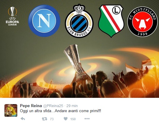 Pepe Reina si conferma leader indiscusso di questo Napoli. Lo spagnolo, stamane, ha caricato i tifosi partenopei attraverso il proprio profilo Twitter col messaggio: “Oggi un’altra sfida…Andare avanti come primi!!!”. Il numero uno azzurro stasera dovrebbe trovare spazio tra i pali del Napoli nonostante l’ampio turnover che farà Sarri. Ecco il tweet del portiere azzurro: