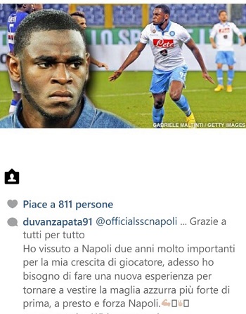 Dopo due stagioni nel complicatissimo ruolo di vice-Higuain, il colombiano Duvan Zapata lascia Napoli per traferirsi in prestito all’Udinese. L’attaccante azzurro ha voluto salutare attraverso il suo profilo Instragram il Napoli ed i napoletani con un messaggio: