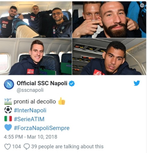 Buonumore e tanti sorrisi tra gli azzurri, in partenza verso Milano. In basso, il tweet della SSC Napoli con alcune foto dall’aereo della comitiva azzurra.