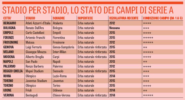 Dunque, da questa tabella, sembrerebbe che l’erba del San Paolo, rizollato nel 2013, sia in condizioni mediocri alla pari dello Stadio Friuli, Marassi, a cui va l’ingrato titolo di campi peggiori del campionato e che potrebbero penalizzare gli azzurri in questa stagione.