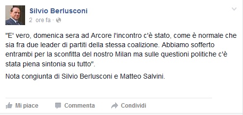A testimonianza di ciò, ecco il comunicato congiunto dei due politici pubblicato ieri sul profilo Facebook del patron rossonero: