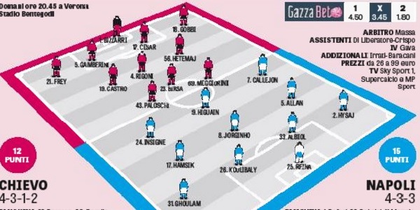 Di seguito il grafico formazioni pubblicato dall’edizione odierna della Gazzetta dello Sport, il quale ipotizza le probabili scelte che Rolando Maran e Maurizio Sarri potrebbero fare in vista di Chievo-Napoli, in programma domani sera alle 20:45 allo stadio Bentegodi di Verona.