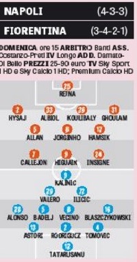 Di seguito il grafico pubblicato dall’edizione odierna della Gazzetta dello Sport, il quale ipotizza le probabili formazioni che Maurizio Sarri e Paulo Sousa manderanno in campo dal primo minuto domenica al San Paolo per Napoli-Fiorentina.