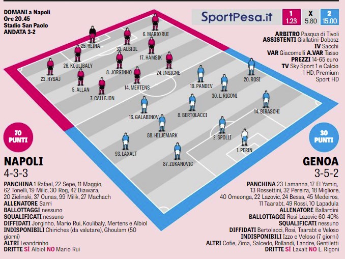 Il grafico con le probabili formazioni di Sarri e Ballardini per Napoli-Genoa: