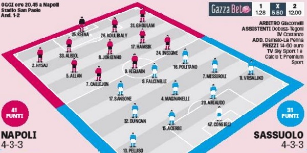 Di seguito il grafico formazioni pubblicato dall’edizione odierna della Gazzetta dello Sport, il quale ipotizza le probabili scelte che Maurizio Sarri ed Eusebio Di Francesco manderanno in campo dal primo minuto questa sera al San Paolo per Napoli-Sassuolo, l’anticipo della 20esima giornata di Serie A in programma alle 20:45.