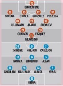 Il grafico formazioni con le probabili scelte di Novellino e Sarri per Palermo-Napoli