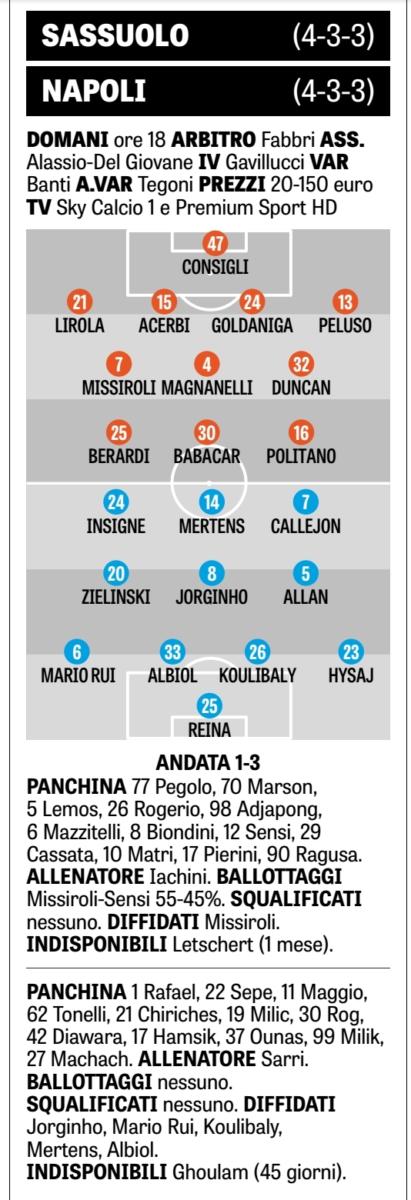 Torna il campionato dopo la sosta per le amichevoli delle Nazionali. Azzurri impegnati al Mapei Stadium di Reggio Emilia per Sassuolo-Napoli, il match in posticipo pre serale delle 18. L’edizione odierna di Gazzetta e Corriere dello Sport pubblicano il grafico con le probabili formazioni che Giuseppe Iachini e Maurizio Sarri manderanno in campo dal primo minuto questa sera alle 18.