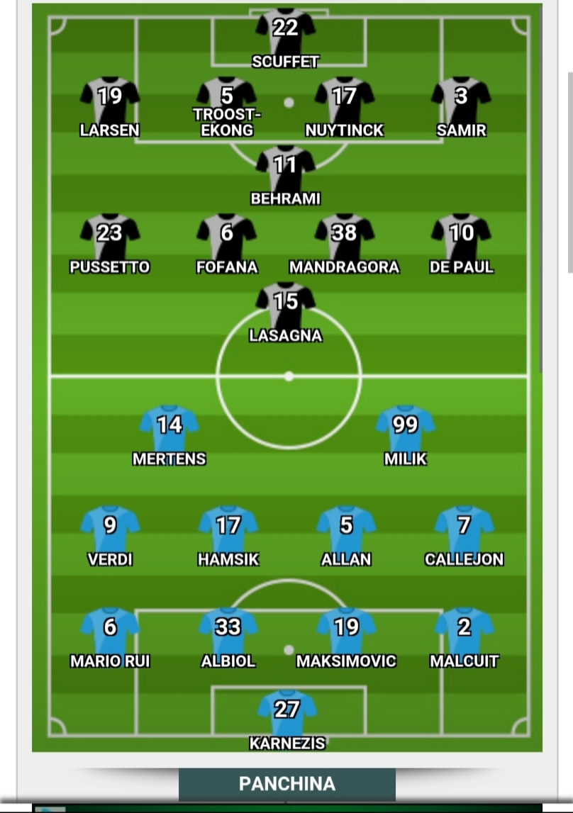 Napoli – In attacco un’assenza pesante: Insigne è indisponibile per la trasferta di Udine. Koulibaly, rientrato anzitempo dal Senegal per un piccolo problema fisico, è in dubbio. Nel caso dovesse riposare, Maksimovic prenderebbe il suo posto. A destra giocherà Malcuit e non Hysaj, a sinistra torna Mario Rui. A centrocampo possibile chance per Fabian Ruiz. Davanti probabilmente ci saranno Mertens e Milik, mentre in porta giocherà Karnezis. Ecco il grafico: