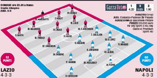 Il grafico con le probabili formazioni di Lazio-Napoli