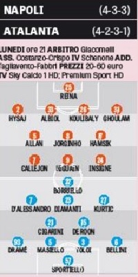 Gli azzurri tornano in campo dopo il ko dell’Olimpico con l’obiettivo secondo posto. Tre ballottaggi in casa Napoli: Ghoulam-Strinic, Allan-David Lopez e Insigne-Mertens, con quest’ultimo favorito. Mentre l’Atalanta, con l’obiettivo salvezza raggiunto, stravolge squadra e modulo. Di seguito il grafico pubblicato dall’edizione odierna della Gazzetta dello Sport, il quale ipotizza le probabili formazioni che Maurizio Sarri ed Edy Reja manderanno in campo dal primo minuto lunedi sera al San Paolo per Napoli-Atalanta.