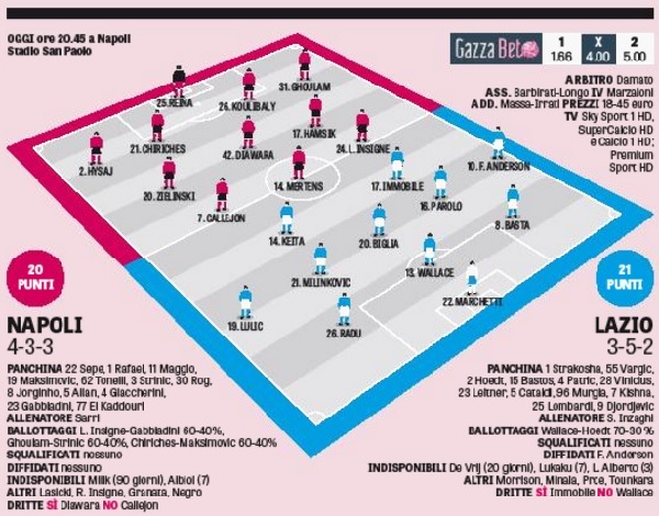 Il Grafico con le probabili formazioni di Napoli-Lazio