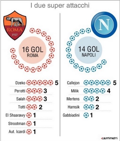 Nel grafico pubblicato dal quotidiano si evidenzia l’incisività dei due attacchi sulla classifica delle rispettive squadre. A partire da Mertens e Dzeko, che vivono un momento di forma fantastico confermato anche dalle ottime prestazioni con le rispettive Nazionali. Poi c’è Milik che tra campionato e Champions League è già a quota sette reti. Sono tante le soluzioni offensive a disposizione di Sarri e Spalletti, con abbondanza di attaccanti esterni di tutto rispetto. Tuttavia i giallorossi hanno a disposizione una variabile tattica che spesso si è dimostrata letale: Francesco Totti, autore di due reti su rigore fino a questo momento. Nell’attacco azzurro manca all’appello al gol solo Lorenzo Insigne, mentre tra i giallorossi rimangono in astinenza da gol solo Iturbe e Gerson (che però non hanno mai giocato in Europa League).