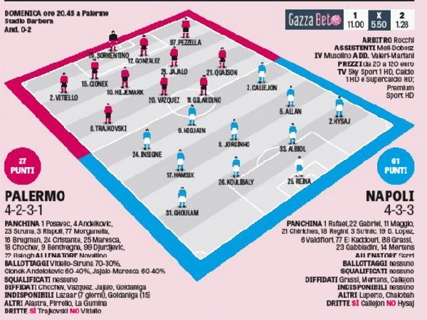 Il grafico con le probabili formazioni di Palermo-Napoli