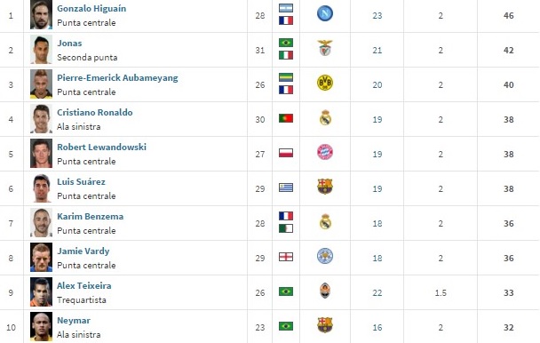 Ventritrè reti in altrettante gare. Questo lo score che mantiene l’attaccante del Napoli Gonzalo Higuain in testa alla speciale classifica della Scarpa d’oro 2015-16, il premio assegnato al calciatore che, durante la stagione, ottiene il miglior punteggio calcolato moltiplicando la somma di gol segnai per il coefficiente di difficoltà del campionato in cui gioca: nella top 5 attuale dietro Higuain, a 46 punti, c’è Jonas del Benfica con 42 punti, Pierre-Emerick Aubameyang del Borussia Dortmund con 40 ed il trio Cristiano Ronaldo–Lewandowski–Suarez con 38 punti. Ecco il gfrafico con la classifica dei primi 10: