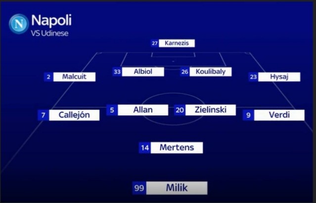 La formazione di Sky vede un Napoli schierato in campo con il modulo 4-4-1-1: Karnezis; Malcuit, Albiol, Koulibaly, Hysaj; Callejon, Allan, Zielinski, Verdi; Mertens; Milik.