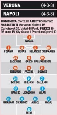 Di seguito il grafico pubblicato dall’edizione odierna della Gazzetta dello Sport, il quale ipotizza le probabili formazioni che Andrea Mandorlini e Maurizio Sarri manderanno in campo dal primo minuto domenica alle 12:30 al Bentegodi per Verona-Napoli.