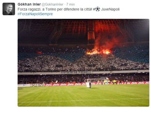 Gokhan Inler, ex centrocampista del Napoli e ora al Leicester, non ha mai dimenticato i tifosi azzurri e la città. Guardate cosa ha pubblicato sul proprio profilo twitter poco prima del big-match di Torino tra Juventus e Napoli