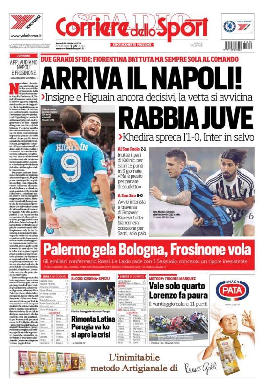 L’edizione odierna del Corriere dello Sport dedica la sua prima pagina al successo del Napoli sulla Fiorentina al San Paolo ed al pareggio a reti bianche nel Derby d’Italia: “Arriva il Napoli! La vetta si avvicina“, e nel sotto titolo spiega: “Insigne e Higuaìn ancora decisivi, la vetta si avvicina“.