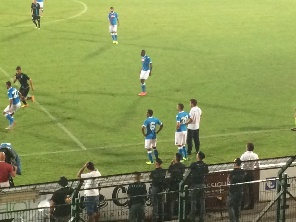 45′ Ripresa la gara a Trento tra Napoli – Feralpi Salò. Squadra rivoluzionata rispetto alla prima frazione: Henrique per Maggio, Valdifiori per Jorginho, Inler per Hamsik, Rafael per Gabriel, Gabbiadini per Merten