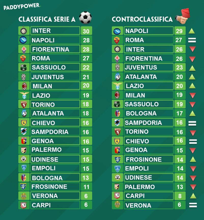 Napoli in testa alla ControClassifica di Paddy Power! Roma seconda e Inter al terzo posto con la Fiorentina! Che ve ne pare?