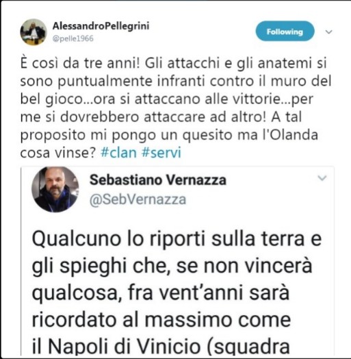 Il giornalista, Sebastiano Vernazza, ha scritto su Twitter: “Qualcuno lo riporta sulla terra e gli spieghi che se non vincerà qualcosa, fra vent’anni sarà ricordato come il Napoli di Vinicio (squadra forte, peraltro)”.