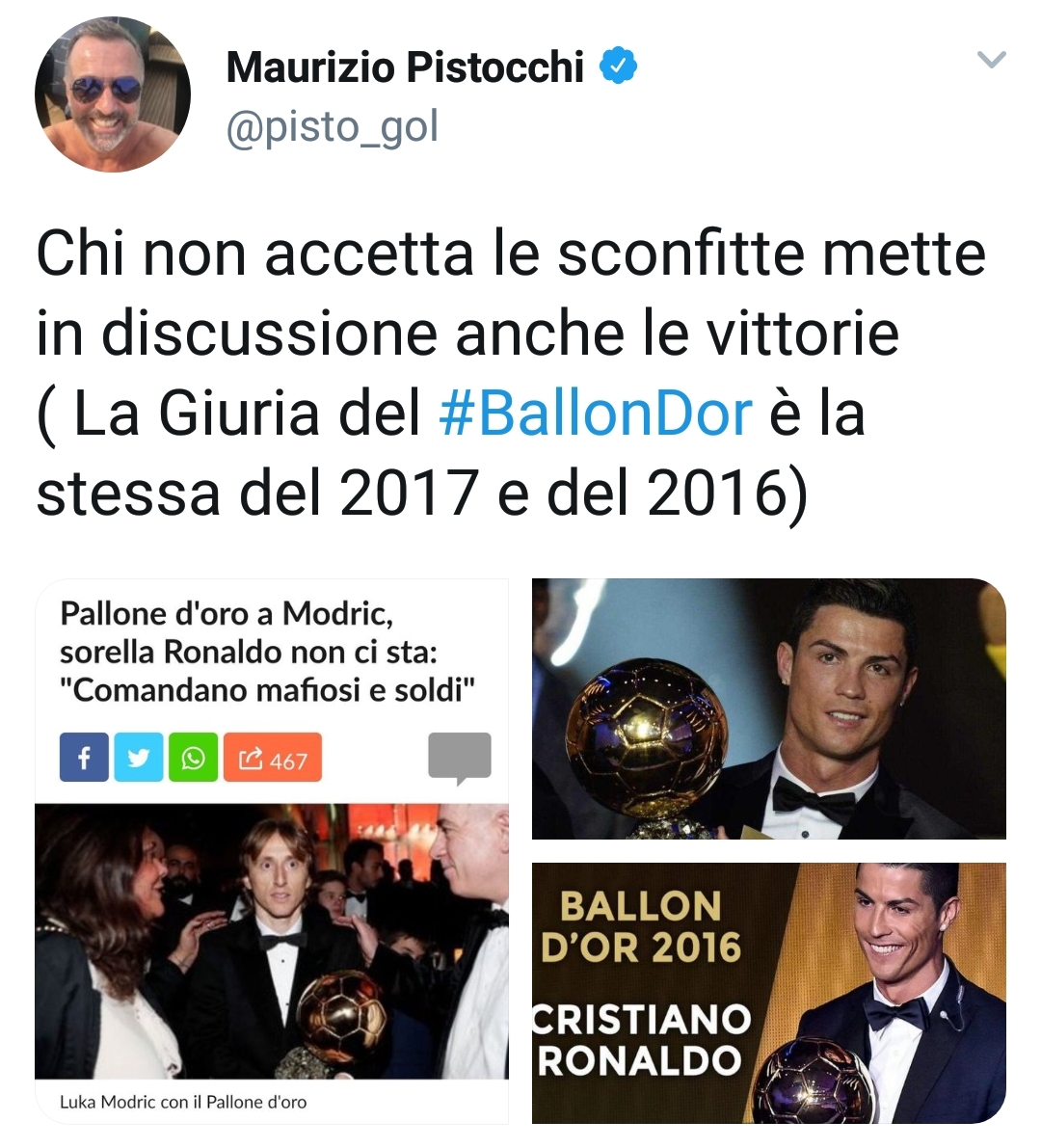 La reazione sopra le righe di staff e familiari di Cristiano Ronaldo, oltre che dei tifosi juventini, per l’assegnazione del Pallone d’oro a Modric, è oggetto di un tweet al vetriolo di Maurizio Pistocchi: “Chi non accetta le sconfitte mette in discussione anche le vittorie ( La Giuria del #BallonDor è la stessa del 2017 e del 2016)”, scrive il giornalista dal proprio profilo Twitter.