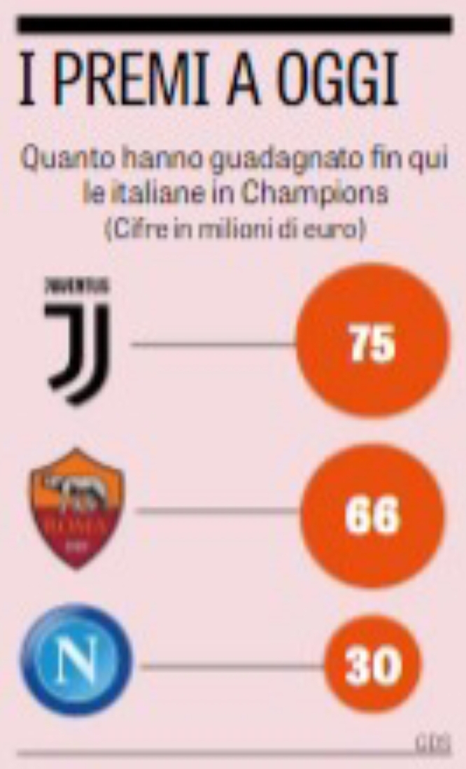 “I bianconeri fin qui hanno incassato un po’ di più della Roma grazie al market pool del campionato. Infatti i premi Uefa si dividono in due categorie: quelli sportivi e quelli da contratti tv. Per quelli sportivi la cifra di bianconeri e giallorossi è la stessa: 12,7 milioni (qualificazione ai gruppi); 5,5 (risultati nei gruppi); 6 (ottavi); 6,5 (quarti). Totale: 30,7 milioni per ciascuna. C’è poi anche il Napoli che però, eliminato nel gruppo, si è fermato a 15,7 milioni (12,7 + 3)”.