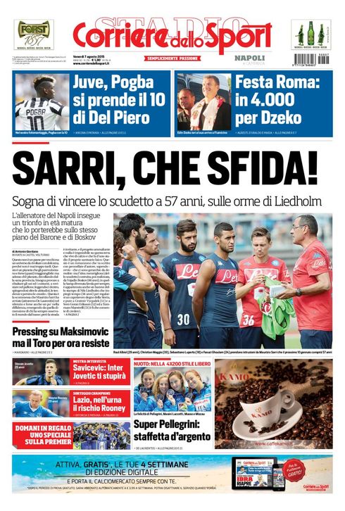 Sarri sfida i giovani. Questo è quanto riporta in prima pagina il Corriere dello Sport-Stadio edizione Campania. Evidenziando che il tecnico appena arrivato alle falde del Vesuvio insegue il suo primo scudetto, come successe Liedholm col Milan, nella stagione 1978-1979.