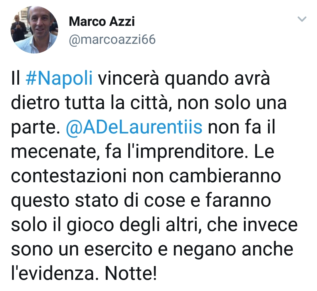 “Il Napoli vincerà quando avrà dietro tutta la città, non solo una parte. De Laurentiis non fa il mecenate, fa l’imprenditore. Le contestazioni non cambieranno questo stato di cose e faranno solo il gioco degli altri, che invece sono un esercito e negano anche l’evidenza”.
