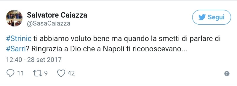 Il giornalista del Roma Salvatore Caiazza risponde a Strinic su Twitter: “Ti abbiamo voluto bene ma quando la smetti di parlare di Sarri? Ringrazia a Dio che a Napoli ti riconoscevano…”. Strinic in un’intervista aveva ancora criticato la gestione della rosa di Sarri e parlato del fatto che a Napoli non potesse uscire di casa, mentre a Genova ha trovato un ambiente più tranquillo.