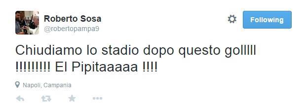 Il Pampa Sosa, ex centravanti e tifosissimo del Napoli, esulta via twitter per il gol da fuoriclasse puro realizzato da Higuain.
